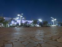 The futuristic architecture of Beijing Bird's Nest Olympic Stadium stands out against the urban skyline as the street lights and tree-lined walkways create a leisurely atmosphere in the nighttime city of Beijing, China.