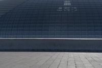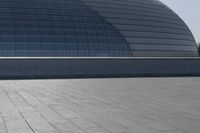 The futuristic architecture of the corporate headquarters stands out against the urban skyline of Beijing, reflected in the surface of its metal wall and open space. The dome, arch and fixed link structure of the roof gives the building a distinct profile.