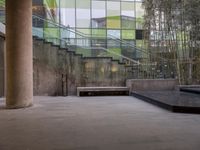 A modern urban cityscape featuring a concrete building with glass windows, a wood facade, a courtyard, and open space with trees and a clear sky. The Sanlitun complex in Beijing is a popular destination for shopping and entertainment.