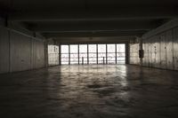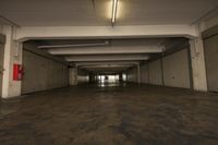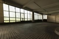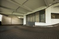 A low angle profile of an empty car park lot with a cobble stone floor and an open space in the backplate, revealing the structure of a building in Berlin, Germany.