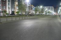 A modern residential neighborhood in Berlin, Germany illuminated by street lights and the artificial light of buildings. Urban infrastructure including roads, curbs and vegetation can be seen in the tints and shades of the night.