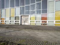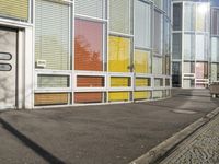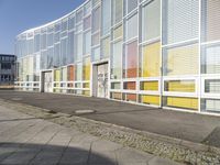A vibrant, multicolored view of an urban business district in Berlin, Germany. The modern architecture of the buildings, storefronts, and offices are framed with glass walls, metal siding, wood, and asphalt roads, creating a unique and dynamic cityscape.