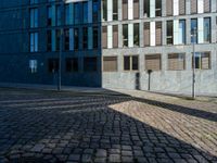 A modern office building in the center of Berlin, Germany casts a hard shadow on the cobble stone surface of the city's bustling financial district on a clear day.