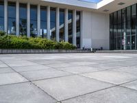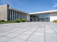 A cobble stone road leads straight down the road, lined by modern glass architecture and a clear sky in the business district of Berlin, Germany.