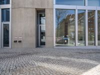 A view of the modern architecture and urban design of the Berlin business district on a clear day. The cobblestone driveway leads to an open space surrounded by asphalt, concrete and walls of residential and office buildings.