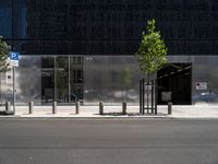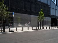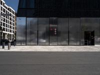 A financial district in Berlin, Germany with a modern architecture of glass, metal, and composite materials. Rectangle shapes, symmetrical facades, and asphalt roads provide a distinct urban design, while trees and vegetation offer a hint of nature in the metropolitan area.