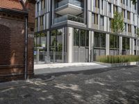 A view of the business district in Berlin, showcasing a mix of classic and modern architecture, with cobblestone roads, metal walls, and open spaces below a cloudy sky.