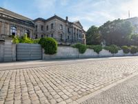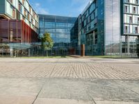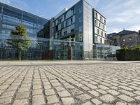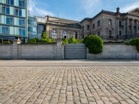 A bird's-eye view of the business district in Berlin, Germany, featuring modern architecture, cobble stone roads, a mix of property types, and open public spaces.