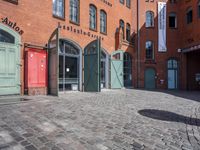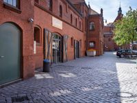 Berlin, Germany is a city of classic architecture and cobble stone roads, with its iconic brick walls, houses, and public spaces. The urban cityscape is filled with blue and red windows, open spaces, courtyards, and doorways, all set against a backdrop of a bustling city and the palace of Deutschland. A cyclist rides by, giving a profile view of the classic brickwork and flooring of the urban neighborhood and real estate.