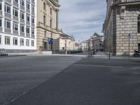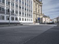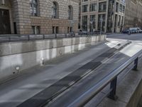 The urban design of Berlin, Germany is evident in the classic architecture, metal guard rail, asphalt roadway, and concrete street. A parking garage and tourist attraction is visible in the background, highlighting the city's infrastructure and metropolitan area.