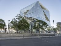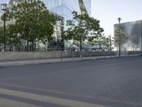 The modern architecture and infrastructure of the European city of Berlin, Germany is showcased in this daytime view of a business district, residential area, and public space with a clear sky and a road surface lined with trees.