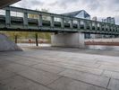 A modern architectural view of the city of Berlin, Germany, with concrete walls, urban design, and a pier in the foreground. The clear sky provides a perfect backdrop for the elevated surface of the river and the jetty landing in the foreground.