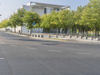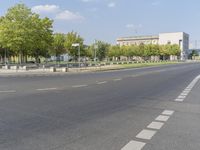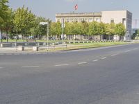 A modern cityscape in Berlin, Germany, featuring a variety of urban elements such as a building, a tree, a road, asphalt, a window, infrastructure, a cloud, a street light, a fence, a motor vehicle, public space, a flag, and a curve. Europe lies in the background with a clear sky and a land lot of tar and vegetation.