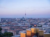 Panoramic view of Berlin, Germany, at dawn. The city skyline with its high-rise buildings and metropolitan area is illuminated by the warm sunlight. Potsdamer Platz, a popular tourist attraction, can be seen in the foreground. The contrast of nature and urban landscape creates a stunning scenery.