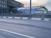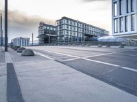 A stunning view of the modern architecture in Berlin, Germany, as dawn breaks over the city. The road, lined with sleek buildings and mixed-use facades, leads to a bustling business district. The infrastructure and public spaces are well-designed, showcasing the urban beauty of this European metropolis.