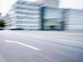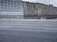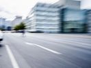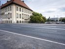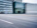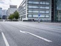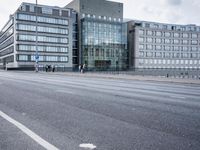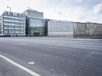 A straight road surrounded by modern architecture and infrastructure of a metropolitan area in Berlin, Germany. An urban business district with a mix of residential buildings, condominiums, high-rises, office buildings, public spaces, bridges, and highways can be seen with a cloudy day sky in the background.