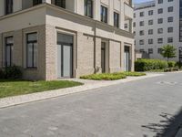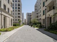 A clear day in Berlin, Europe, with a cobblestone road and a residential area featuring a modern high-rise condominium, trees and shrubs, and a manhole cover providing interesting textures and shades of grey to the brickwork.