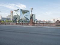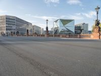 A clear day in the financial district of Berlin, Germany showcases modern architecture, urban design, and bridge spanning a busy city road. This city of business and urban life is located in Europe, and stands out in profile against a clear sky.