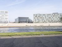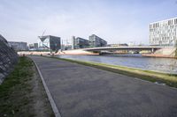A view of Berlin, Germany, features modern architecture with a mix of residential and commercial buildings, a pier, bridge, and a yellow tree set against a clear sky. The cityscape also includes a road surface, asphalt, river, coastal ocean, and a metropolitan area with urban design and public spaces.