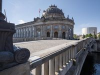 A view of Berlin, Germany's cityscape with its classical architecture and monuments, including palaces, mansions, domes, and sculptures. The cobblestone roads, concrete surfaces, and clear sky make for an ideal vacation spot. Tourists flock to the city to explore its stunning public spaces, real estate, and urban design.