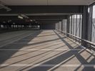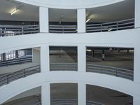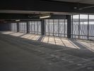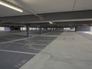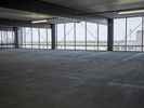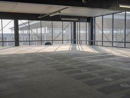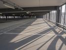 A view of the corporate headquarters building in Berlin, Germany, with its concrete facade, structure, windows, glass, handrail, and urban office building, set against the sunny day. In the distance, an airport can be seen, with a parking lot, parking deck, and parking garage at multiple levels.