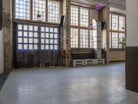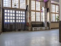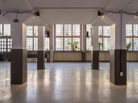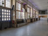 A view of the city of Berlin, Germany reveals its industrial skyline, with elevated courtyards, warehouses, factories, and open spaces made of concrete, metal, and wood materials. The art district venue features high glass windows, sash windows, and vegetation in a loft-style lobby. This elevated urban design reveals the city's architectural profile and interior design.
