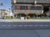 empty intersection in city with large concrete building behind it and traffic lights along side it