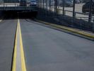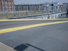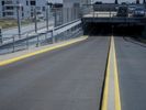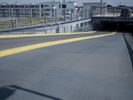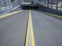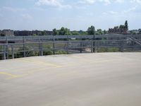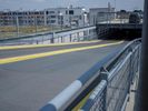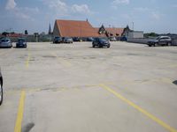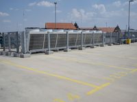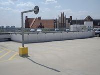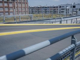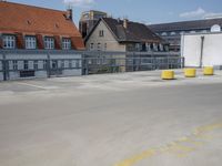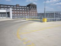 A view of the city of Berlin, Germany featuring modern urban architecture, including buildings, roads, airport infrastructure, open spaces, and more. On the street level, the scene includes an automobile, a parking lot, and a guard rail. On the horizon, a clear sky and a few clouds are visible.
