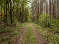 A majestic yet peaceful scene of nature in Berlin, Germany during autumn. The straight road is surrounded by deciduous trees, lush vegetation and a dirt and gravel floor, with clouds covering the sky above.