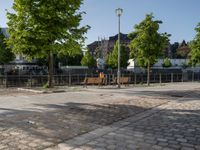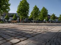 A profile view of a sunny day in Berlin, Germany. The cobble stone street leads to a jetty and pier, providing a scenic view of the urban design and city life of Europe.