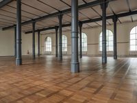 there are wooden floor in an empty warehouse space with windows above them, and several arches and columns
