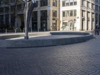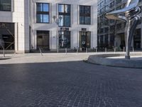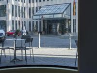 The modern architecture of the Berlin Marriott Hotel stands out against the cobble stone street, surrounded by cafes, restaurants, and public spaces in the vibrant downtown of Berlin, Germany.
