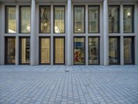 an empty brick courtyard area with two stone columns and two arched windows in the background