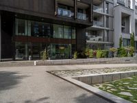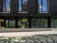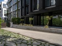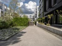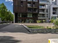 The modern architecture of the residential high-rise condominiums in Berlin, Germany stands out against the clear sky in this 3/4 angle, straight down the road POV shot. The city's infrastructure is comprised of asphalt roads, grey brick facades, trees, and vegetation, creating a unique urban design.