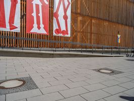 In the heart of Berlin's bustling business district, modern architecture and office buildings stand tall against the clear European sky. The city's urban design is a blend of old and new, with wooden walls and paver surfaces adding a touch of classic charm. Urban staircases and profiles add depth to the cityscape, creating a dynamic environment for city life in Germany.