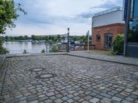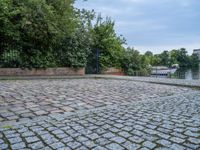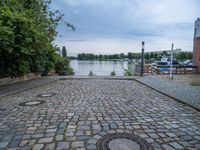 A cobblestone jetty leads straight down to a harbor in Berlin, Germany on a sunny day. The open space pier provides a view of the coastal surface, as the ocean meets the coastline and clouds fill the sky.