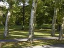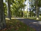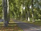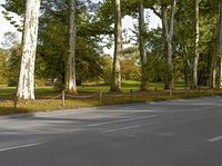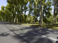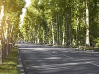 A peaceful residential road in Berlin, Germany on a sunny day. The asphalt lane is lined with trees, vegetation, and lush grass, surrounded by a natural environment. The yellow light of the sun casts shadows on the woody plants and the tar road surface.