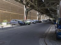 A low-angle view of modern architecture, urban vegetation, and automotive vehicles travelling through the city of Berlin, Germany. The infrastructure of the European city is showcased through a bridge, underpass, and straight road surface.