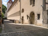 A cobblestone alley-way in the heart of Berlin, Germany, is illuminated by a classic architecture, urban design, and houseplants as the sun rises over the city. Bicycles, motor vehicles, tints and shades, and a graffiti wall are among the fixtures of this neighborhood.