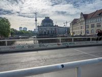 A view of the city of Berlin, Germany, showcasing the modern architecture, with roads, buildings, guard rails, walls, and a river flowing through the metropolitan area. The urban design of the city provides a unique charm to the city, with its tourism, infrastructure and property all being an integral part of the vibrant cityscape.