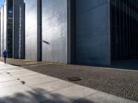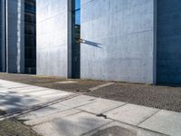 A composite material road surface, rectangular grey flooring, asphalt, wood, and paver elements create a modern urban design in the financial district of Berlin, Germany on a sunny day with a clear sky. Automotive tires, walls, windows, and doors of a building facade are tinted in shades of black and white and accented by vegetation and trees.