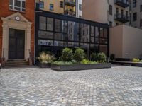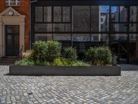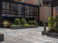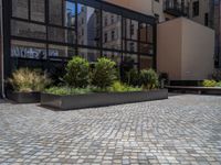 several plants sit in decorative concrete planters along the sidewalk of a building that is very modern