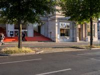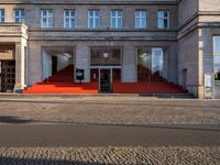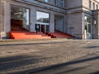 A hard shadow casts across the cobblestone road and storefronts of a classic Berlin architecture in Germany's art district, illuminated by the rising dawn light. Asphalt roads lined with residential property, house, and trees, create a unique profile of the urban European city.