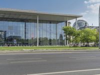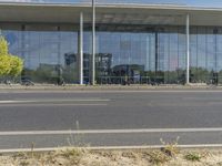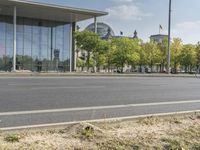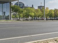 The city of Berlin, Germany is showcased here with its modern architecture, asphalt road surface, and urban design. Buildings, public spaces, street lights, and vegetation are also highlighted, as well as a motor vehicle and tire in the foreground. This scene is typical of a day in Europe with its clear sky and tar composite material.