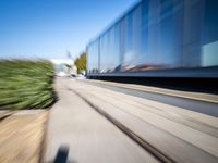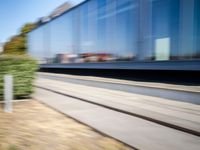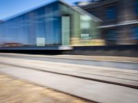 A view of the dynamic modern architecture and infrastructure of Berlin, Germany. The cityscape is illuminated by the sunlight of a new day, with blue reflections of the highway, lane, and track glinting off the asphalt road surface. Automobiles blur by in the foreground, while the industrial atmosphere of the art district is highlighted by a mix of concrete, wood, steel, glass, and walls.