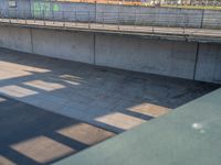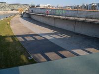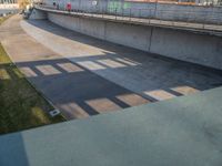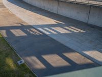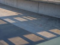 An elevated view of the city of Berlin in Europe reveals the hard shadows of modern architecture spread across an open surface of pavers and asphalt at the break of day.