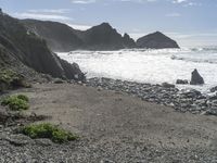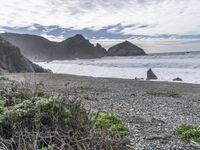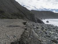 An elevated view of the Big Sur coastline in California, USA. The rugged terrain of the Pacific Coast Highway, featuring sand, dirt, gravel, asphalt and rock surfaces, is set against the backdrop of the majestic coastal mountain range and the tranquil ocean shore. The natural environment of this highland landscape reveals glimpses of a lake, cliff faces, moraines, fjords and more, creating a unique and breathtaking horizon.