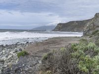 A view of the Pacific Coast Highway and the coastal landscape of Big Sur, California USA, with its headland, sea, shore, cliff, promontory, rock, beach, lake, ocean, natural environment, terrain, geology, klippe, water, sand, mountain, grass, bedrock, outcrop, vegetation, soil, thoroughfare, fault, formation, and dike.