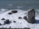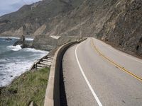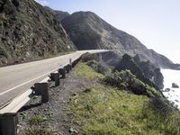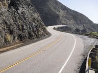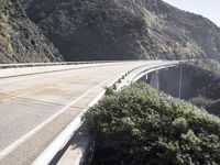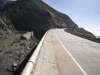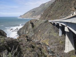 A sunny day in California presents a stunning view of the Pacific Coast Highway, winding through the Big Sur region. The coastal mountain landforms and the tree-lined highway create an impressive backdrop to the bright blue ocean and clear sky, with a guard rail along the S-curve for protection.