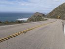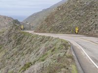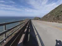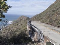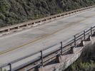 A view of Big Sur, California, USA, a coastal mountain landscape with a concrete bridge, an armco barrier, and a curving road along the Pacific Coast Highway, illuminated by the sun with a clear sky and contrails in the background.